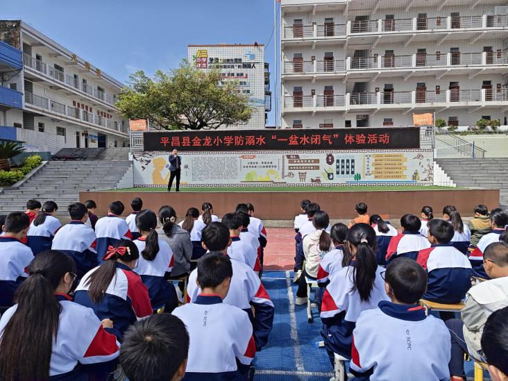 2026年4月29日,平昌县金龙小学组织全体师生开展“一盆水闭气”防溺水体验式演练活动,以沉浸式教育强化学生安全防范意识。