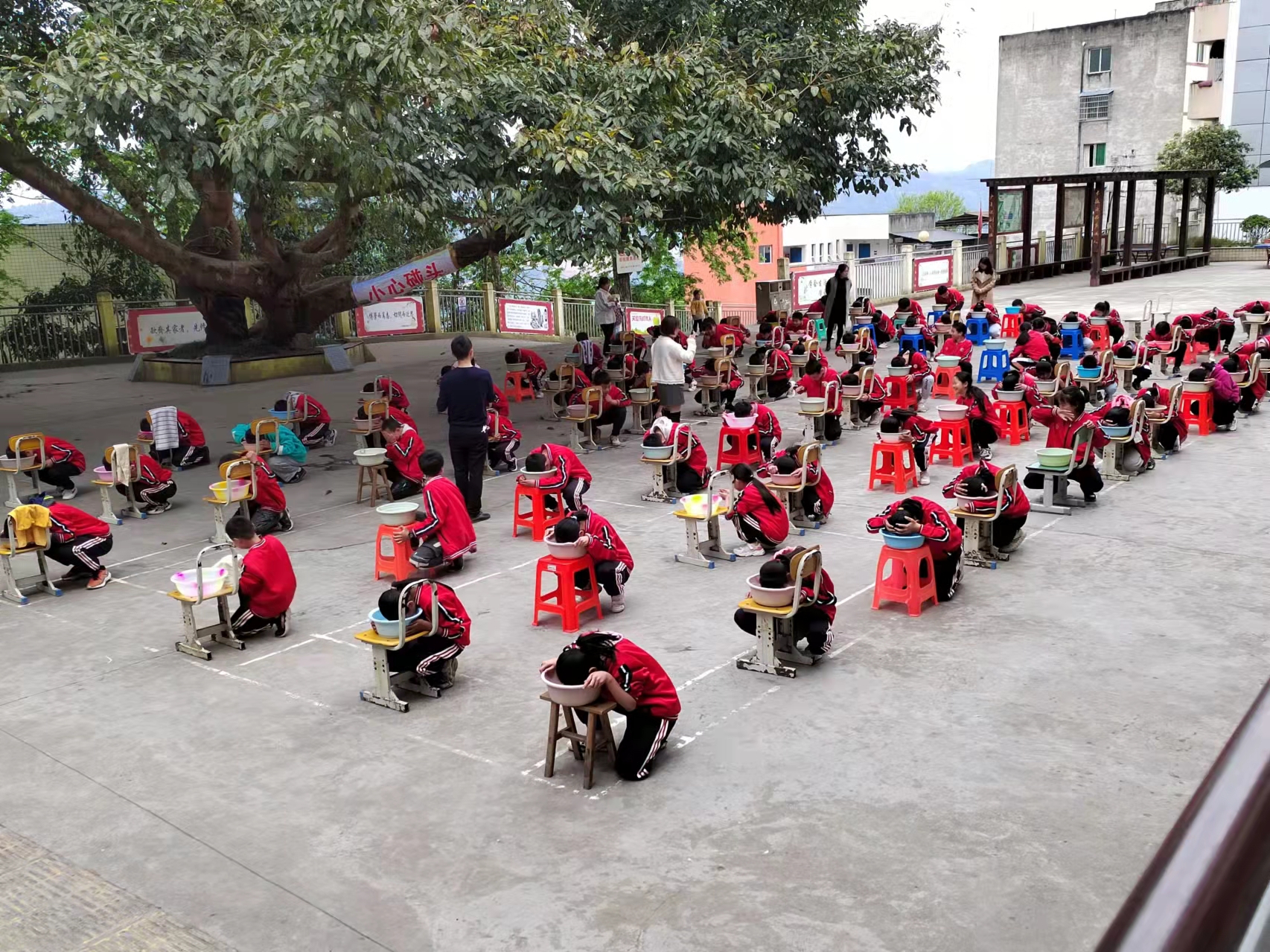 在第28个全国中小学安全教育日, 石城初级中学开展防溺水“一盆水”闭气体验活动。