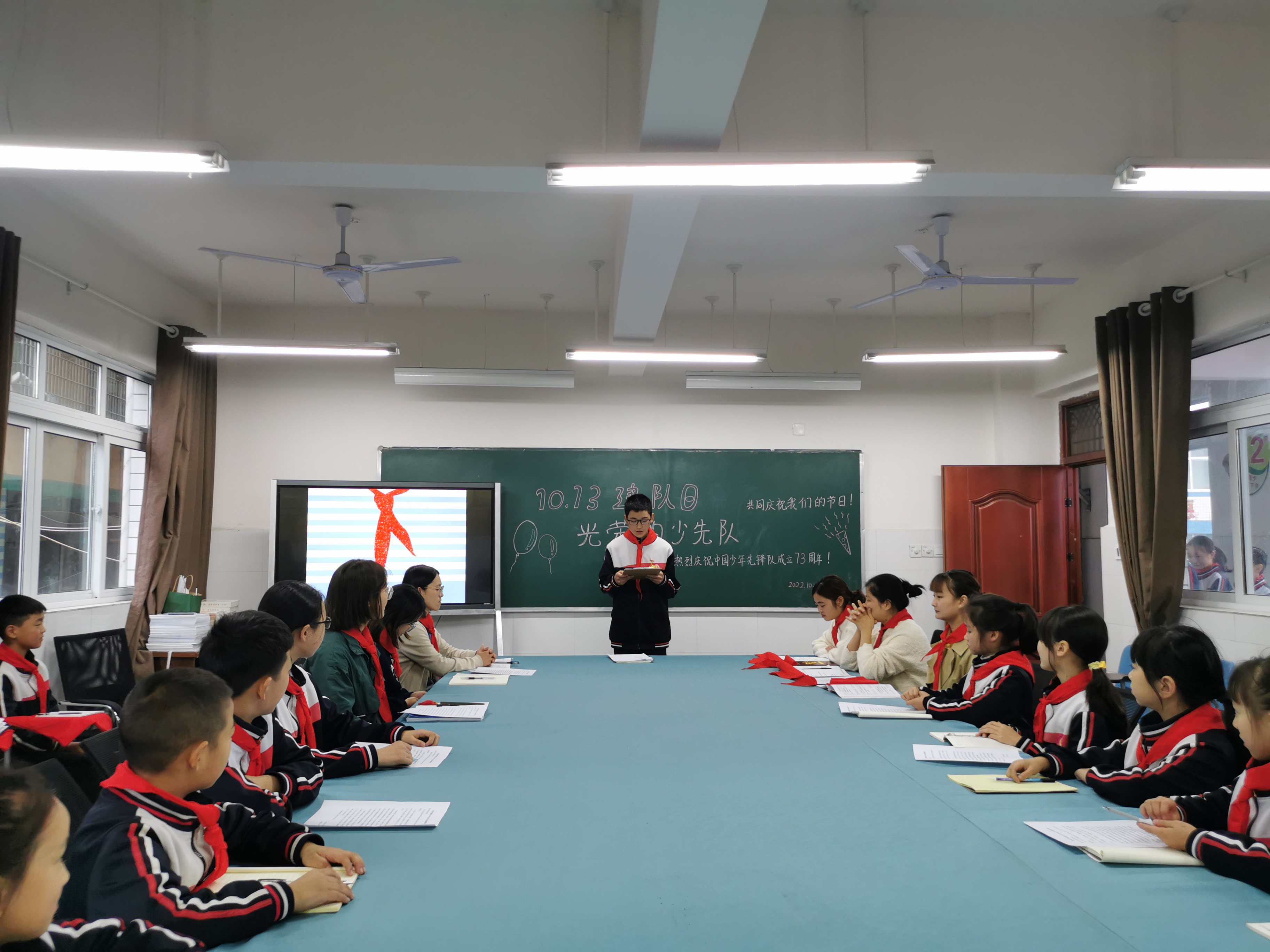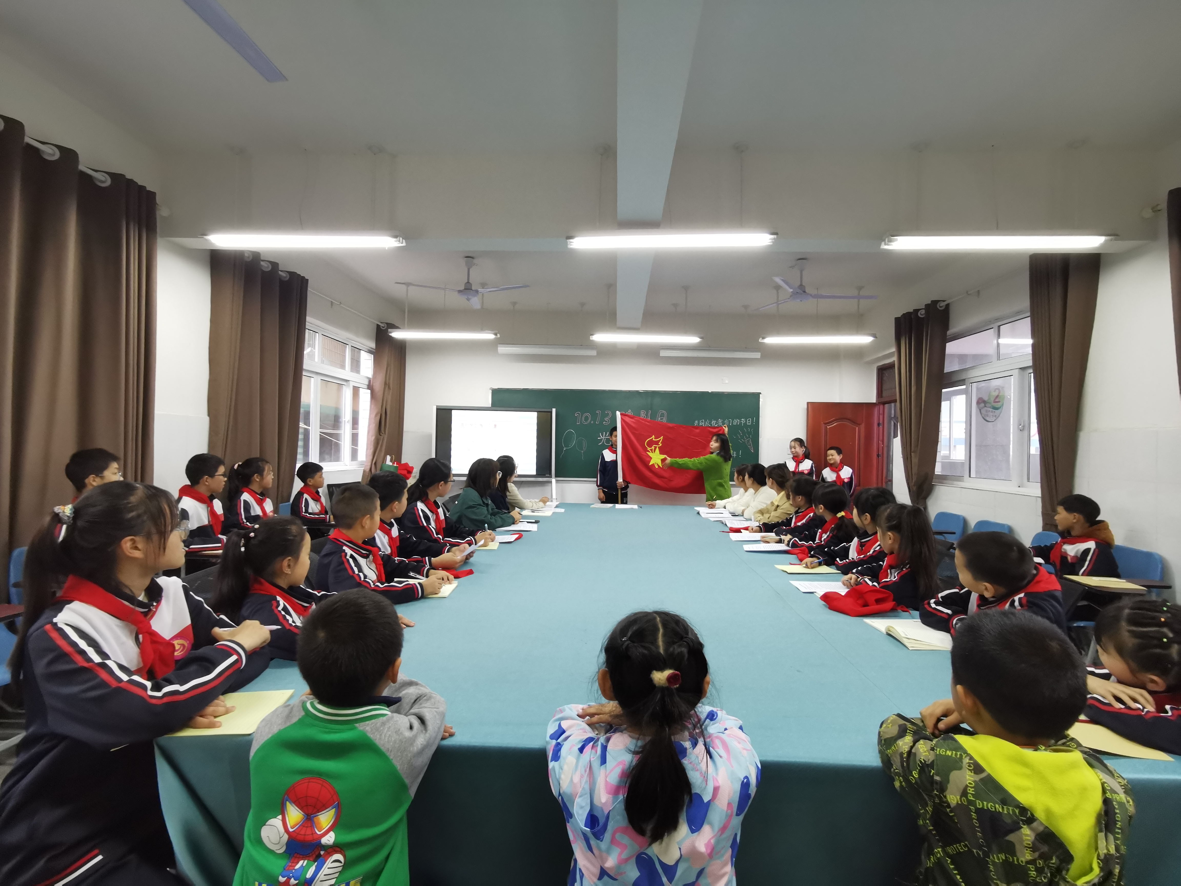 在嘹亮的出旗曲声中,旗手高举大队旗走入会场,主题活动课拉开序幕。“中国少年先锋队是中国少年儿童的群团组织......”少先队总辅导员张晓铃带领中队辅导员、中队长、队员代表了解少先队知识,学系红领巾、敬礼,重温入队誓词,讲述红色故事,学习英雄事迹等,开展少先队活动课《光荣的少先队》。吟唱着动人的旋律,宣读着铿锵的誓言,行着有力的队礼......活动课使我们收获满满。