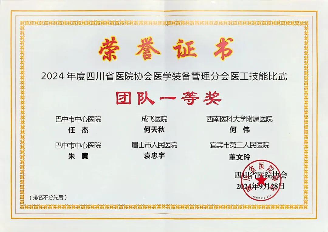 本次技能比武主要围绕急救生命类支持设备的维修、质控及理论知识展开,全省共39家医院近百余名选手参加竞赛,我院朱寅、任杰一路过关斩将最终获得医工技能比武一等奖。此次竞赛体现了我院医学装备部工程师丰富的理论知识和熟练的维修技能,更体现了巴医人团结互助、敢于拼搏的精神,获得了所有参赛医院的一致好评。医学装备部将再接再厉,持续提高维修、质控技术,更好的为临床服务。