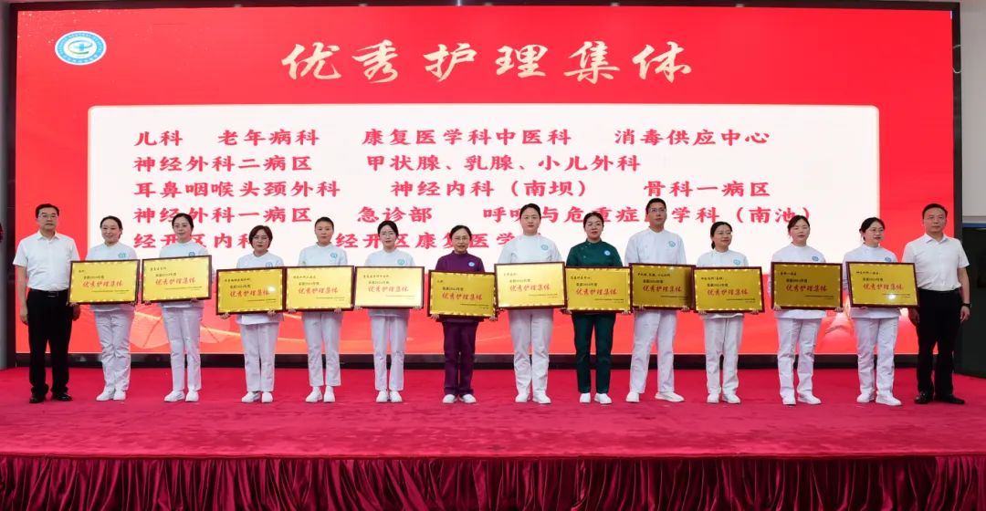 党委副书记陈朝学宣读表扬文件。会议表扬了12个优秀护理集体、12个人文护理示范病房、11项护理质量持续改进优秀项目、5名星级网约护士、30名从事护理工作30年及以上护士。