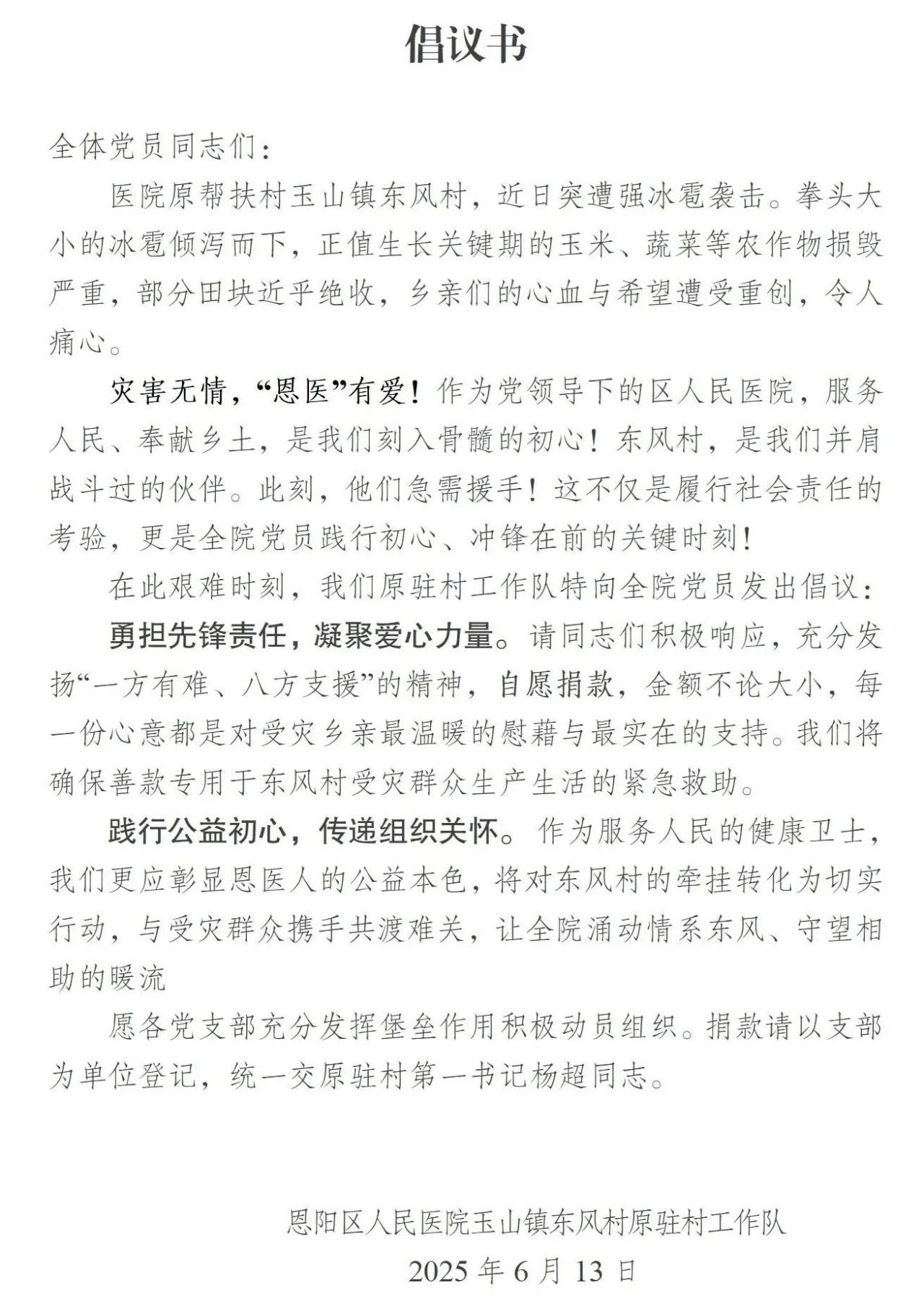 近日,一场突如其来的强冰雹灾害袭击了恩阳区玉山镇东风村,致使该村大面积农作物严重损毁。面对原帮扶村遭遇的灾情,区人民医院闻讯而动,第一时间向全院发出爱心捐款倡议,紧急组织干部职工伸出援手,与东风村受灾群众共渡难关。