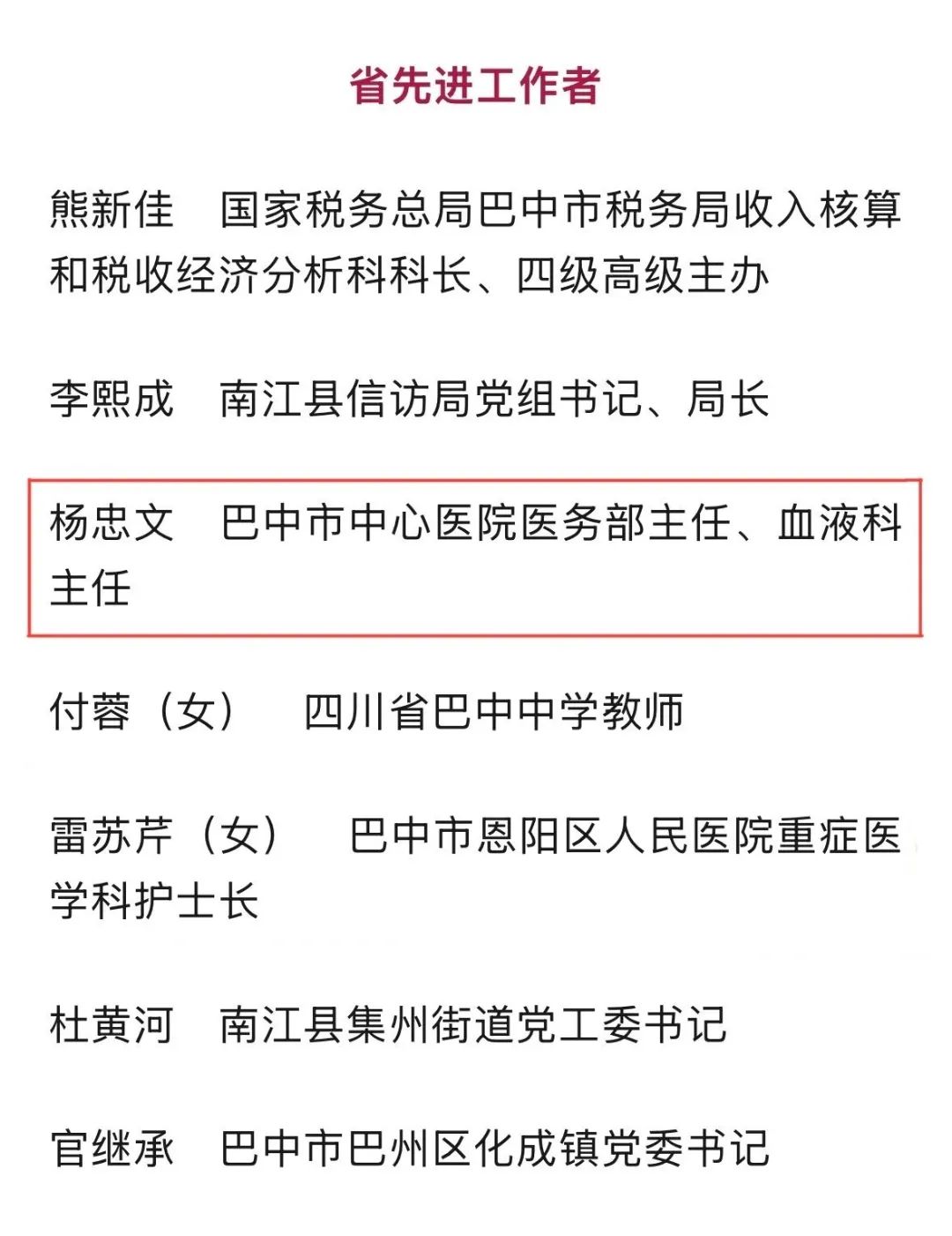 5月7日,中共四川省委 四川省人民政府发布关于表彰四川省第九届劳动模范和先进工作者的决定,授予朱仲强等539人“四川省劳动模范”称号,授予陈东永等261人“四川省先进工作者”称号。其中,巴中市中心医院医务部主任、血液科主任杨忠文荣获“四川省先进工作者”称号。